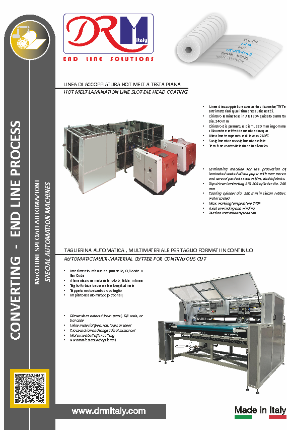 La ditta DRM Srl nasce con l’obiettivo di acquisire il Know-how e l’esperienza trentennale della ditta Daroitex Srl specializzata e conosciuta nel mercato Nazionale ed Internazionale per per la costruzione e fornitura di macchinari di ”FINE LINEA” per il settore tessile, del non-tessuto, tessuti tecnici e finta pelle. Forte dell’esperienza pluridecennale dei propri soci, è in grado di offrire soluzioni innovative, altamente performanti e personalizzate per qualsiasi particolare necessità.